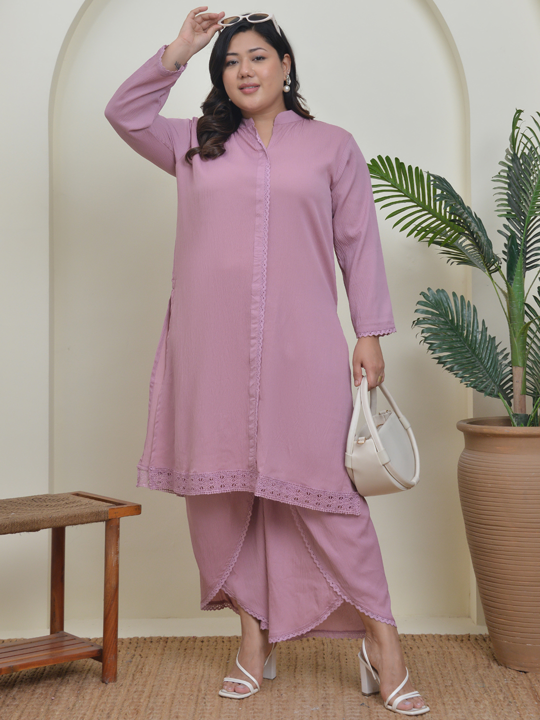 Graceful American Crepe in Mauve. A-line top with full sleeves paired with stylish dhoti-style bottoms. Subtle lace detailing enhances the chic, contemporary look.