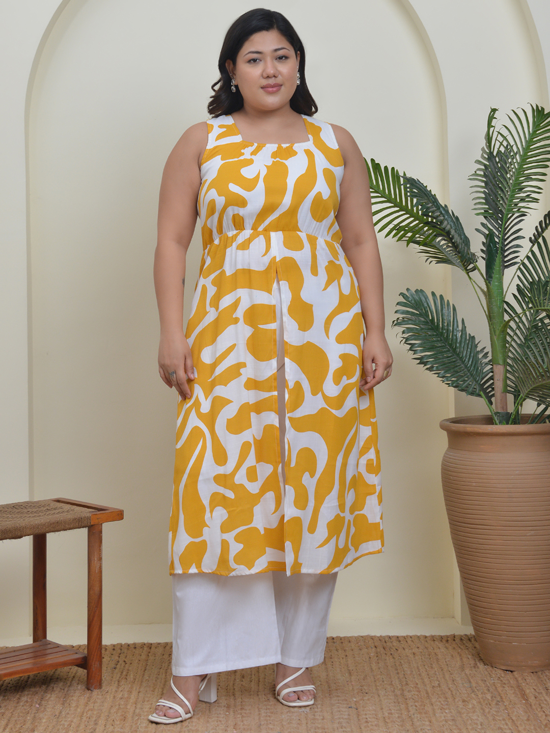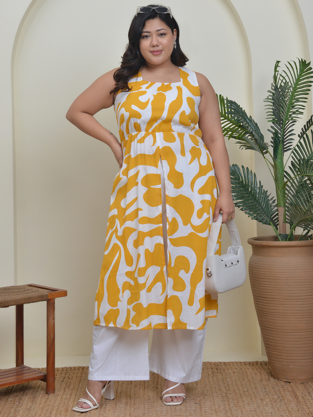 Yellow & White Printed Co-Ord (A-Line Top & Bottom, Sleeveless, Backless)