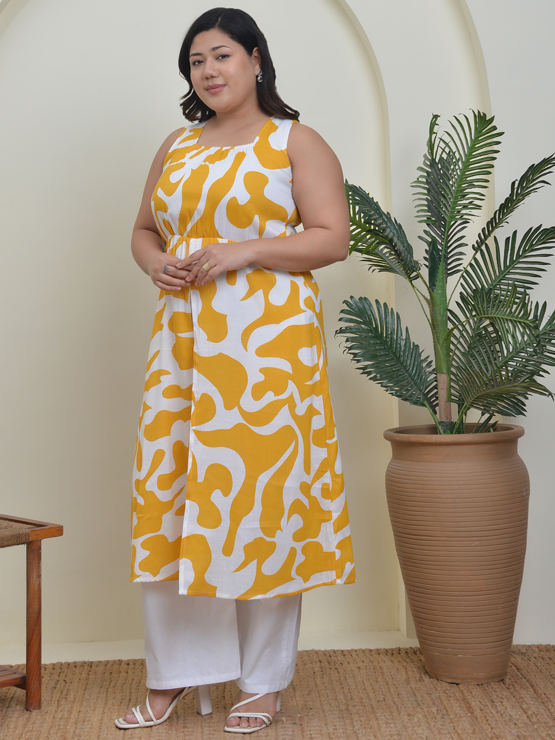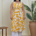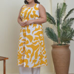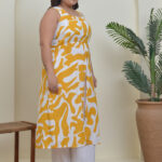 Sunny Yellow & White Cotton co-ord. Printed A-line top with backless style and sleeveless design, paired with matching bottoms. Bright, breezy, and effortlessly stylish.